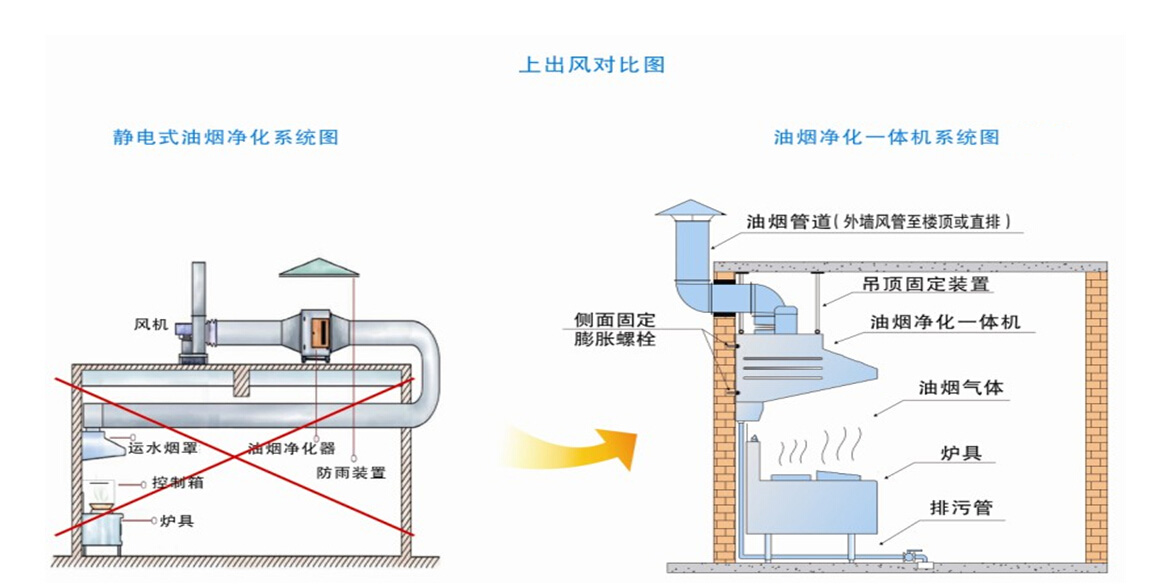 1、油煙進入水噴淋油煙凈化器的第一噴淋室。采用水霧對油煙進行降溫阻攔處理,使油煙和氣體溫度降底,處理后的油霧粒子進入凈化器,風(fēng)管內(nèi)殘留少量油煙。